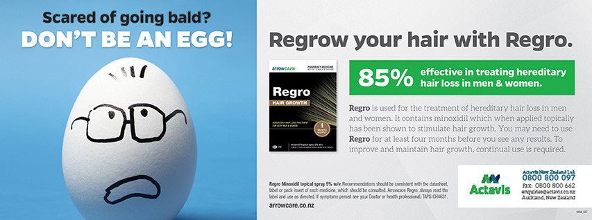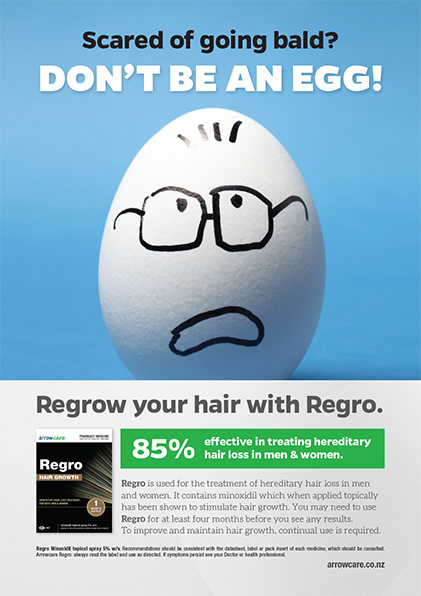 Print and online advertising for Arrowcare Regro, a medication for hair loss.