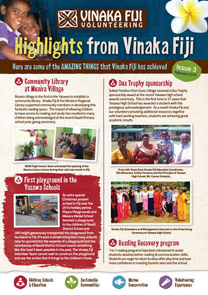 Newsletters to supporters of Vinaka Fiji. A charitable trust set up to help the people of Fiji.